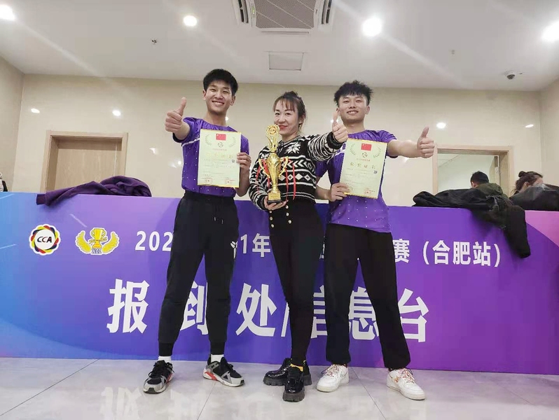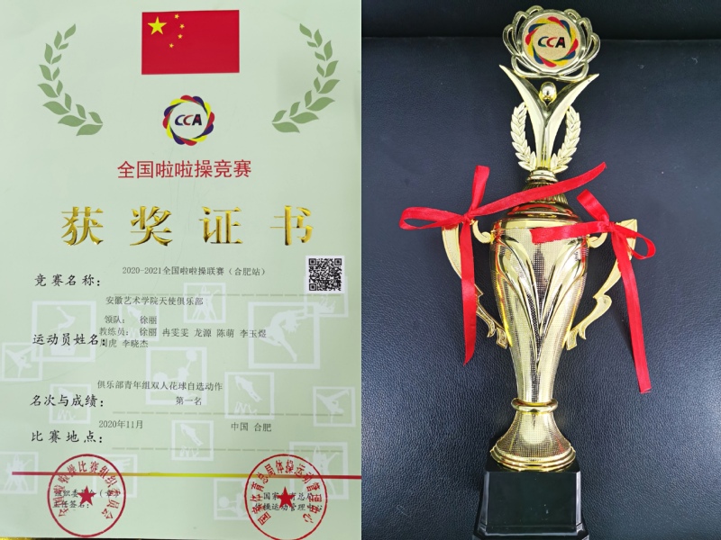 11月28-29日,2020-2021年全国啦啦操联赛(合肥站)隆重举行,本次赛事由国家体育总局体操运动管理中心主办,全国啦啦操委员会、合肥市体育局、新站高新区管委会等共同承办。来自全省各地市的114支代表队共计2500余人参赛。我校啦啦操队周虎、李晓杰(指导教师:徐丽、冉雯雯、龙源、陈萌、李玉煜)获得俱乐部青年组双人花球自选动作第一名。