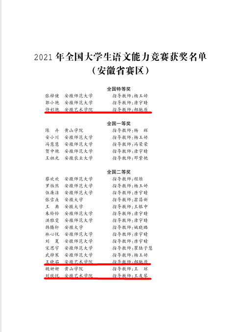近日,第二届全国大学生语文能力竞赛国赛落下帷幕,在学校高度重视和公共教学部的认真组织下,我校新闻学4班侍彩艳获得全国大学生语文能力竞赛特等奖,另有2人分获全国二等奖、三等奖,17人获得省级一二三等奖。安徽艺术学院和安徽大学、安徽师范大学同获“优秀组织奖”。
