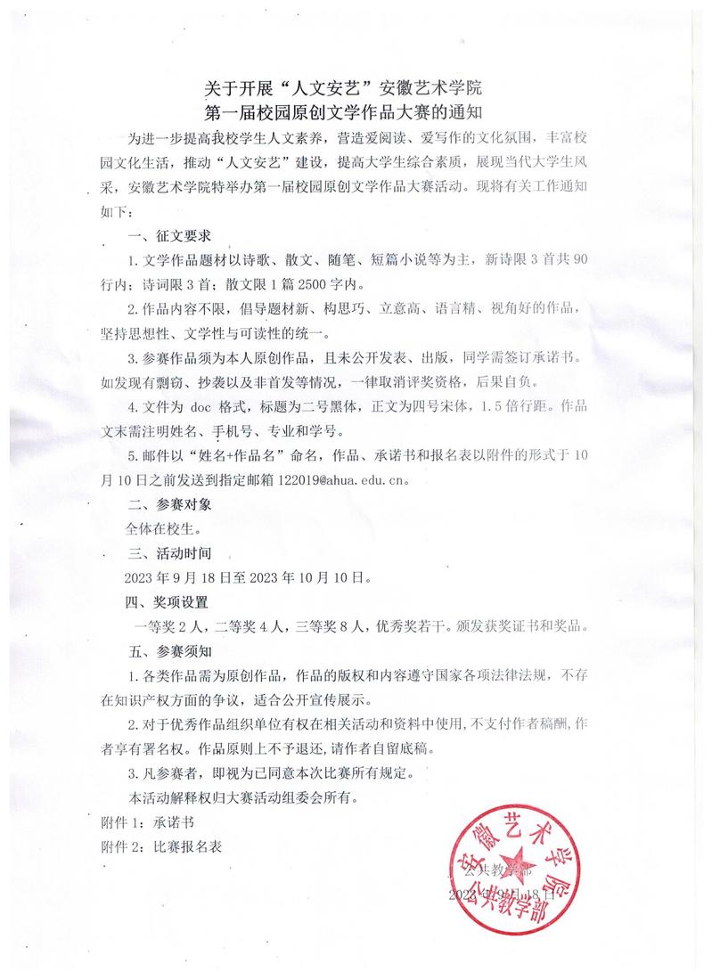 关于开展“人文安艺”安徽艺术学院第一届校园原创文学作品大赛的通知