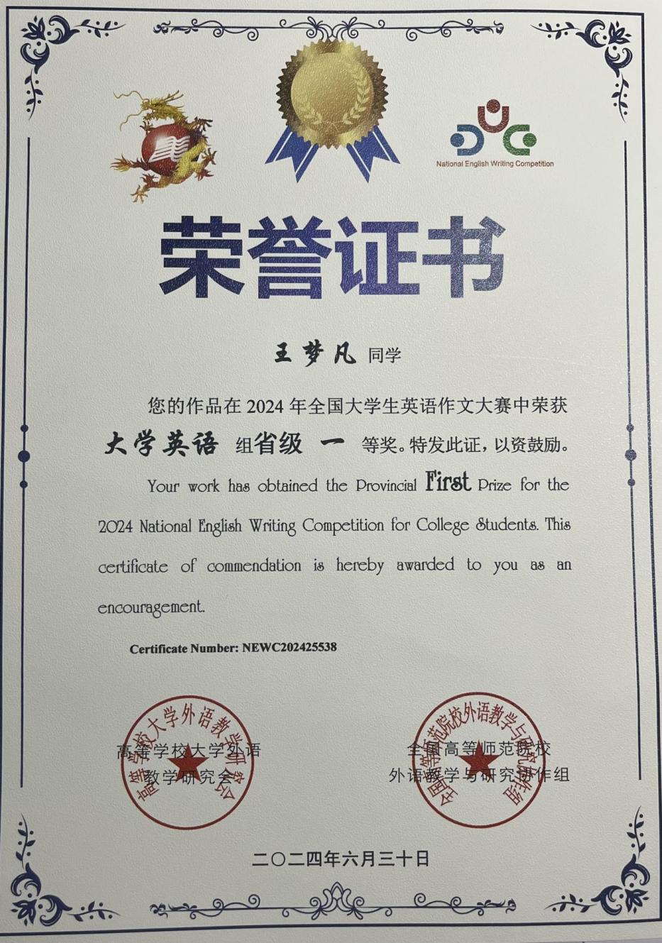 “2024年全国大学生英语作文大赛”经过专家组严格评阅,多轮评选,我校2023级新闻学二班王梦凡同学获省级一等奖。