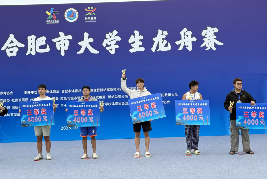 10月12日,2025合肥市大学生龙舟赛在新站高新区少荃湖水域开赛。我校龙舟队与中国科技大学、合肥工业大学等全市17支高校队伍同台竞技,最终荣获三等奖,并实现了赛事成绩新突破,充分展现了我校学子顽强拼搏的体育素养与高效协作的团队能力。
