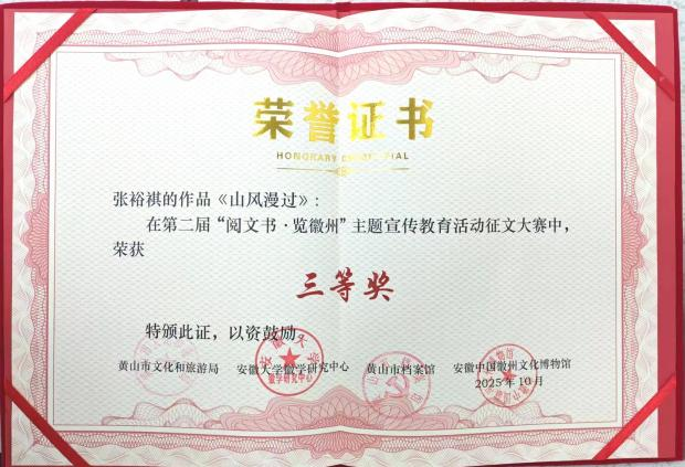 近日,在黄山市文化和旅游局、安徽大学徽学研究中心、黄山市档案馆联合主办,安徽中国徽州文化博物馆牵头承办的第二届“阅文书·览徽州”主题宣传教育活动评选中,我校学子表现突出,荣获征文、短视频、文创三大赛事的奖项。