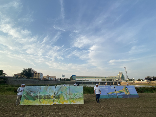 当天当地最高气温36℃,烈日正当头。师生们将12块1.3m*1.5m的画板、12个画架和其他绘画用具搬下大巴后,早已汗流浃背。