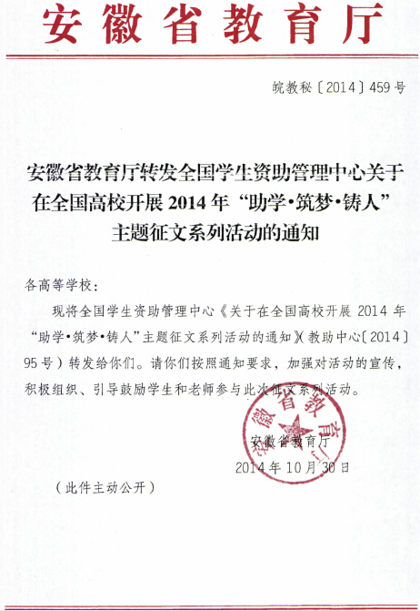 现将安徽省教育厅转发全国学生资助管理中心《关于在全国高校开展2014年“助学•筑梦•铸人”主题征文系列活动的通知》(皖教秘〔2014〕459号)转发给你们。请各系按照通知要求,加强对活动的宣传,组织、引导鼓励学生和老师参与此次征文系列活动。