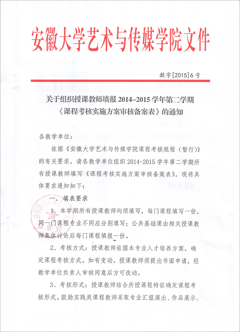关于组织授课教师填报2014-2015学年第二学期《课程考核实施方案审核备案表》的通知