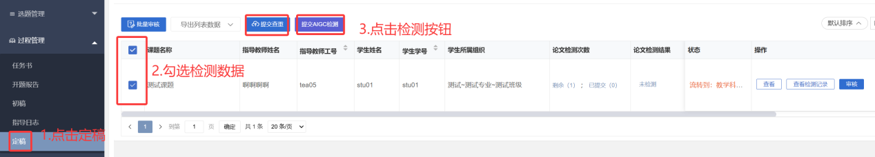学生在毕设系统内上传定稿稿件,指导教师审核通过后由学院统一进行检测。教学科研办主任勾选需要检测的学生后点击左上角“提交查重”“提交AIGC检测”按钮进行检测,定稿检测重复率须达到学校要求学生才可参加答辩,AIGC检测结果显示“全文疑似AIGC生成率”原则上不超过30%。(参考下图)