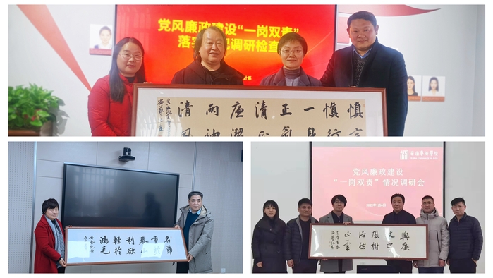 调研结束后,校领导分别向学校各单位赠送了由校纪委组织知名书法家公益创作的廉政书法作品。(撰文:郑军 供图:朱泽军、魏媛媛、李新新等 初核:钱农 编辑:朱新水 初审:张雷雷 审定:王琍琍)
