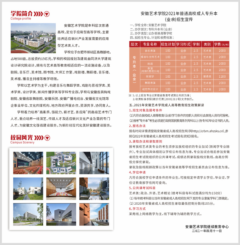 安徽艺术学院2021年普通高校成人专升本(业余)招生宣传材料