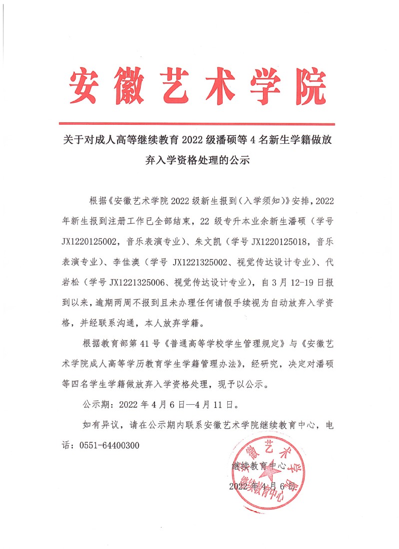 关于对成人高等继续教育2022级潘硕等4名新生学籍做放弃入学资格处理的公示