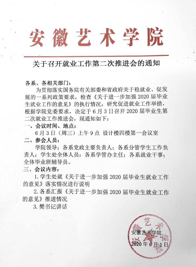 为贯彻落实国务院有关部委和省政府关于稳就业、促发展的一系列政策要求,检查《关于进一步加强2020届毕业生就业工作的意见》的执行情况,研究促进就业工作举措,根据学院党委要求,决定于6月3日召开2020届毕业生第二次就业工作推进会,现通知如下: