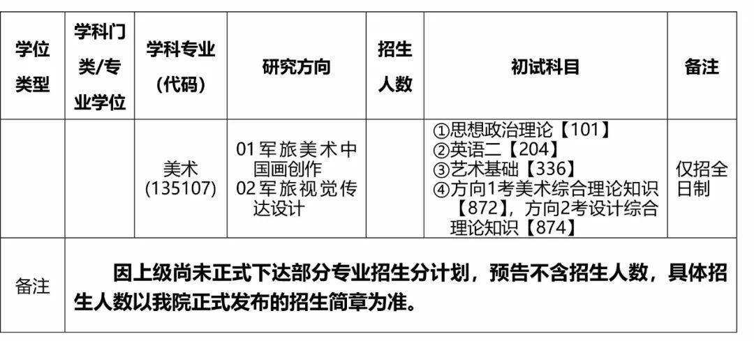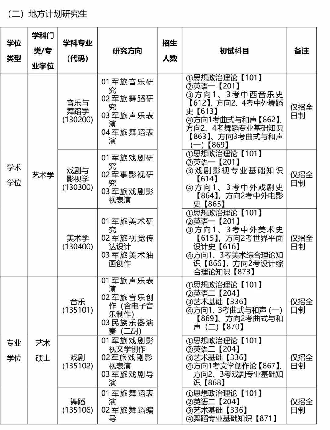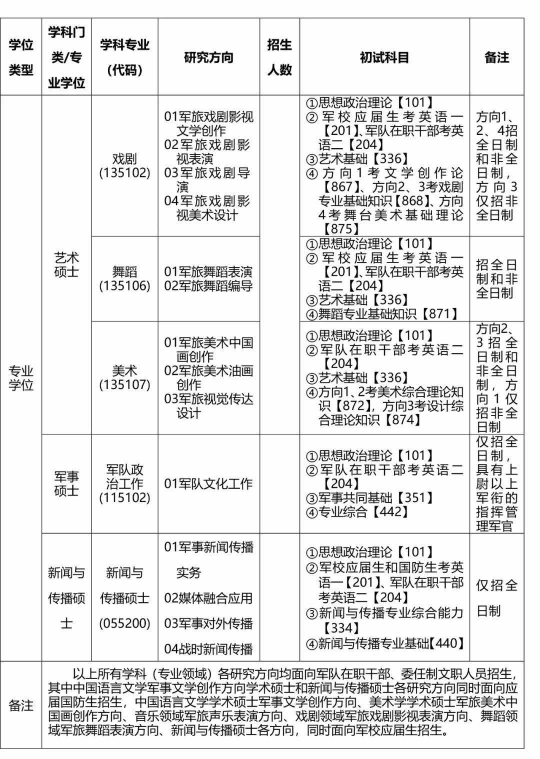 6.报考我院艺术硕士专业学位研究生所有研究方向和学术学位研究生7个研究方向(军事文学创作、军旅声乐表演、军旅舞蹈表演、军旅戏剧影视表演、军旅美术中国画创作、军旅美术油画创作、军旅视觉传达设计),须具备创作表演实践经验,并达到我院相关专业方向招收硕士研究生所需的专业水平。专业水平考(审)核于研招网正式报名结束前组织,由学院成立相应专业方向导师组实施。未参加我院专业水平考(审)核,或参加考(审)核但未通过者,不予核发准考证。专业水平考(审)核有关要求如下: