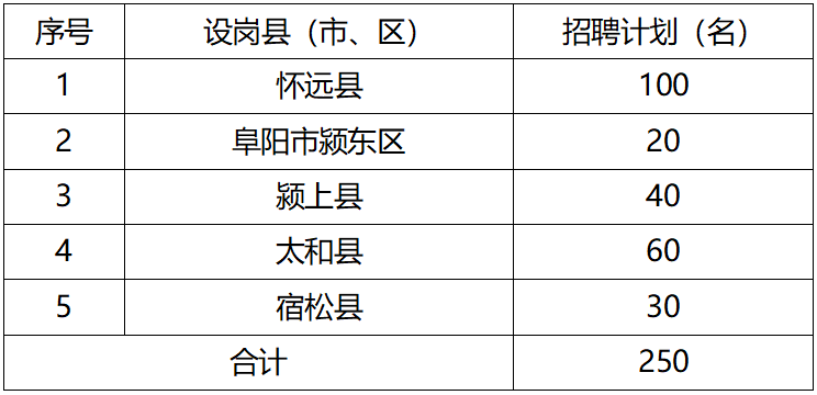 在各地申报审核的基础上,2025年国家下达我省“农村义务教育阶段学校教师特设岗位计划”(下称“特岗计划”)250名,实施范围为:蚌埠市怀远县,阜阳市颍东区、颍上县、太和县,宿松县等5个脱贫地区。安徽省2025年“特岗计划”分县区招聘计划表见附件1。