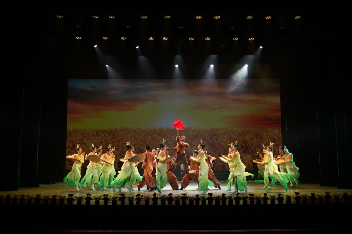 我校青年舞蹈团的演员们以按下“十八颗红手印”的故事性演绎引出花鼓灯舞蹈《希望的田野》,用国家级非遗传统舞蹈形式呈现1978年小岗村包干到户后翻天覆地的变化。