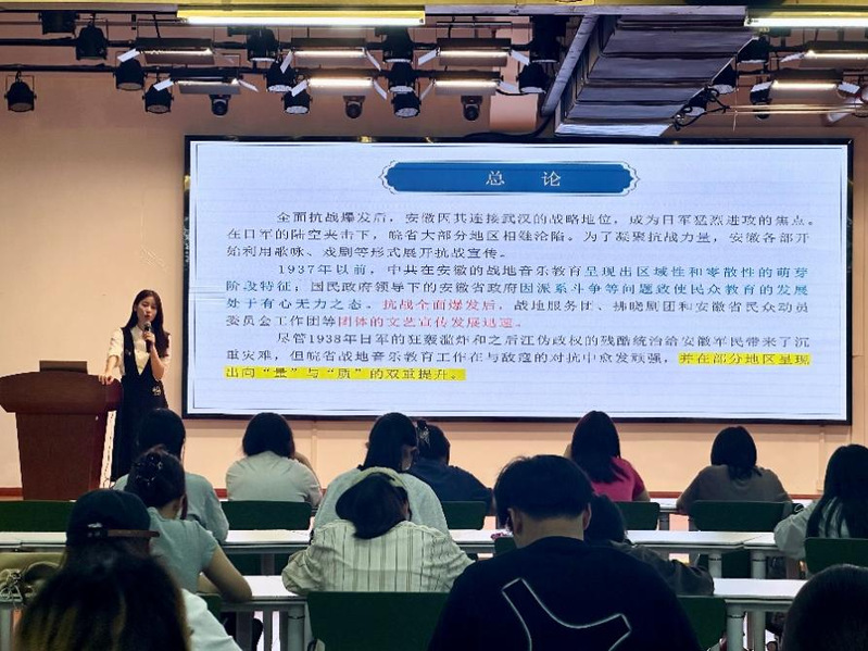 “徽文化”是科研辅助教学的重要举措之一。本次“安徽地区战地音乐教育”讲座,不仅激起了同学们对那段历史及相关红色主题艺术作品的兴趣,还推动了安徽地区战地音乐教育及爱国主义情怀在高校的传承。