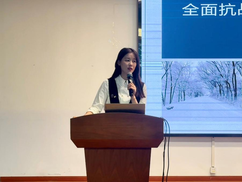 张珂首先简述了安徽地区战地音乐教育的基本释义,向在座的同学们介绍了战地音乐教育的发展脉络。随后通过播放相关的抗战时期影视作品片段,并通过相关数据证明其呈现出区域性和零散性的特点。安徽地区战地音乐教育具有悠久的历史和红色文化特征,在当时安徽地区的农民对土地有着强烈的执着和浓厚的依赖,他们世代耕作,日常娱乐活动十分贫乏。因此如何调动身处偏远地区,文化生活极为匮乏的广大农民,并将他们组织成抗战生力军,成为当时驻扎在安徽这个农业大省的各级部队亟待解决的难题,而对于安徽地区战地音乐教育的研究至今仍对社会生活和红色文化传承有着非常积极的作用。现场张珂和同学们进行了关于安徽地区战地音乐教育相关问题的深入互动,加深了同学们的战地音乐教育认识和理解,厚植爱国主义情怀,树立了正确的价值观和人生观。