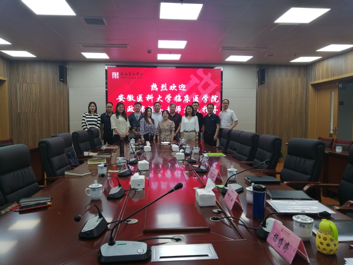 6月4日下午,安徽医科大学临床医学院思政部主任王兆良教授一行6人来我校考察交流。校党委副书记、院长樊嘉禄,党委委员、宣传部部长吴孔铎,人事处处长吕中华,科研处处长陈明海,马院副院长陈昀岚及部分教师代表参加考察交流会。会议由陈昀岚主持。