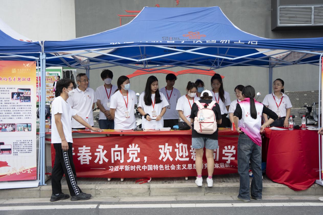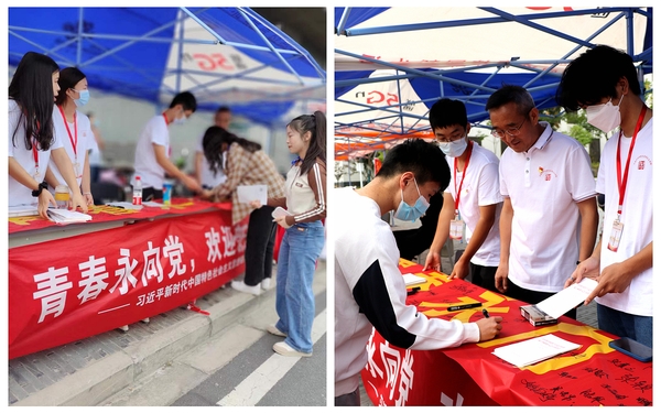 为喜迎党的二十大胜利召开,深化推动党史学习教育常态化长效化,持续做好“我为师生办实事”,为新生上好“开学第一课”,9月20日2022级新生报到当日,马克思主义学院直属党支部与习近平新时代中国特色社会主义思想研究会(以下简称思研会)联合开展“迎新党员先锋岗”主题党日和“青春永向党,欢迎新同学”校园签名活动,从新生们踏入校门的第一时间就将思想政治教育融入其中,为学生扣好进入大学校园的第一粒扣子。