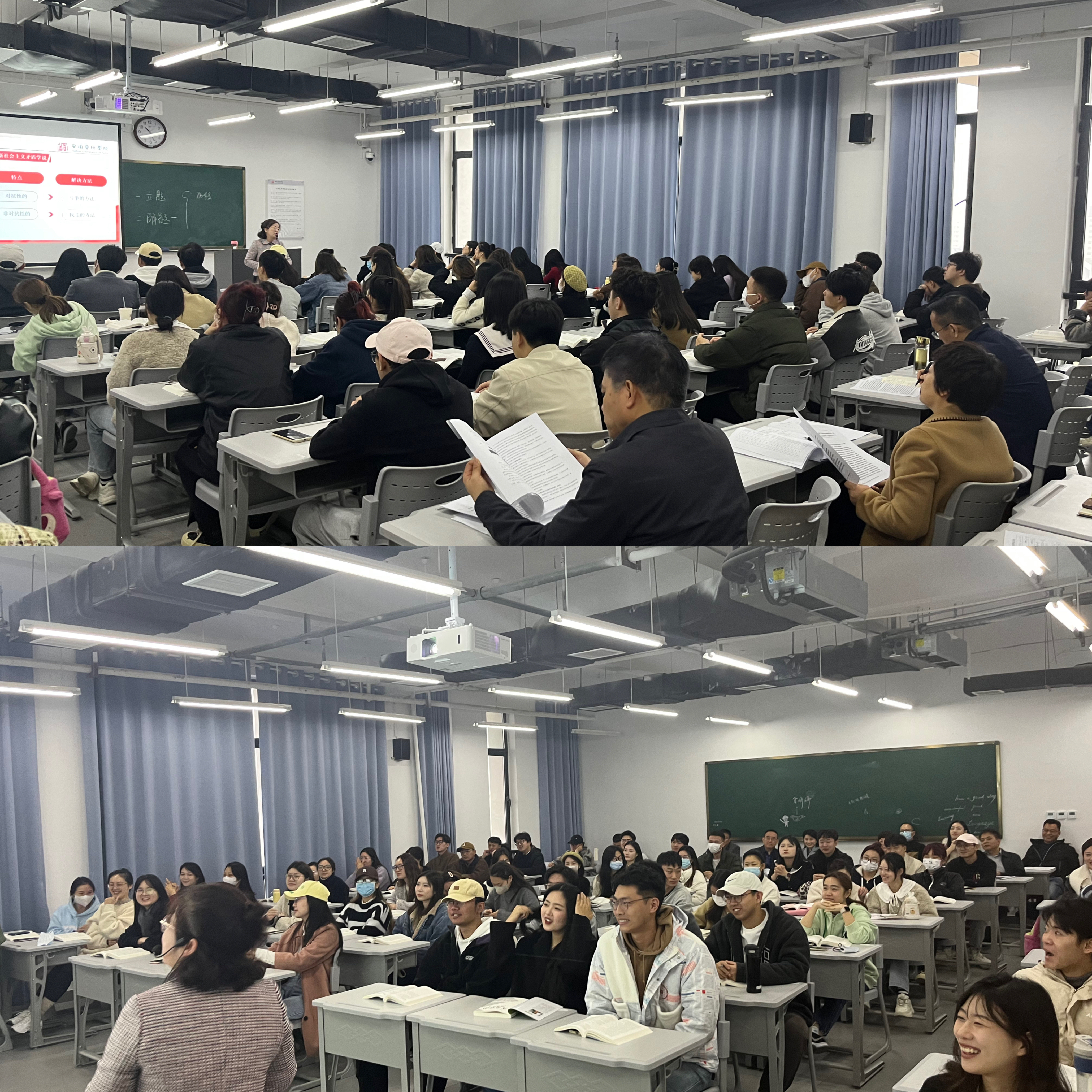 公开课由马克思主义学院副院长陈昀岚老师讲授。陈昀岚老师以“如何正确认识社会主义建设的成就与探索中的曲折”为题,综合运用系统讲授法、案例教学法、问题链等教学法,为同学们详细讲述了中国共产党探索社会主义道路的艰苦历程以及探索中取得的重要成果和意义。特别是采用“问题链”教学模式,将教材体系转化为为什么、怎么办和如何看三个逻辑严密的问题,有效激发大学生学习的好奇心和求知欲,注重学生历史思维、辩证思维的培养,同时结合学生专业特长发挥学生主体性,实现教师主导性与学生主体性的有机结合,注重师生互动,课堂气氛热烈。