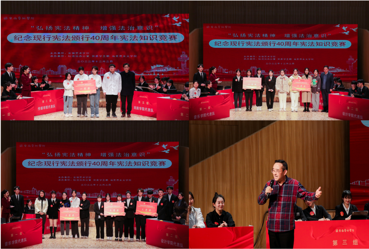 本次活动由安徽艺术学院主办,校法治办、校学工部和马克思主义学院承办,主题是“弘扬宪法精神 增强法治意识”。经过激烈的角逐,最终美术学院荣获团体一等奖,传媒学院、舞蹈学院荣获团体二等奖,戏剧学院、音乐学院、设计学院荣获团体三等奖。