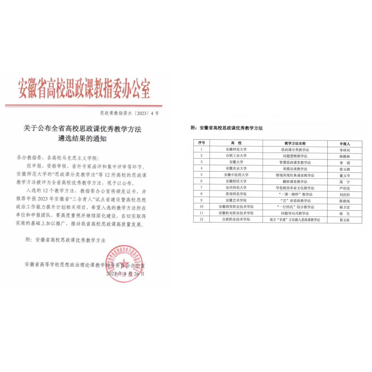 近日,安徽省高等学校思想政治理论课教学指导委员会公布了全省高校思政课优秀教学方法遴选结果,我校马克思主义学院副院长陈昀岚主持的“艺”讲思政教学法成功入选。