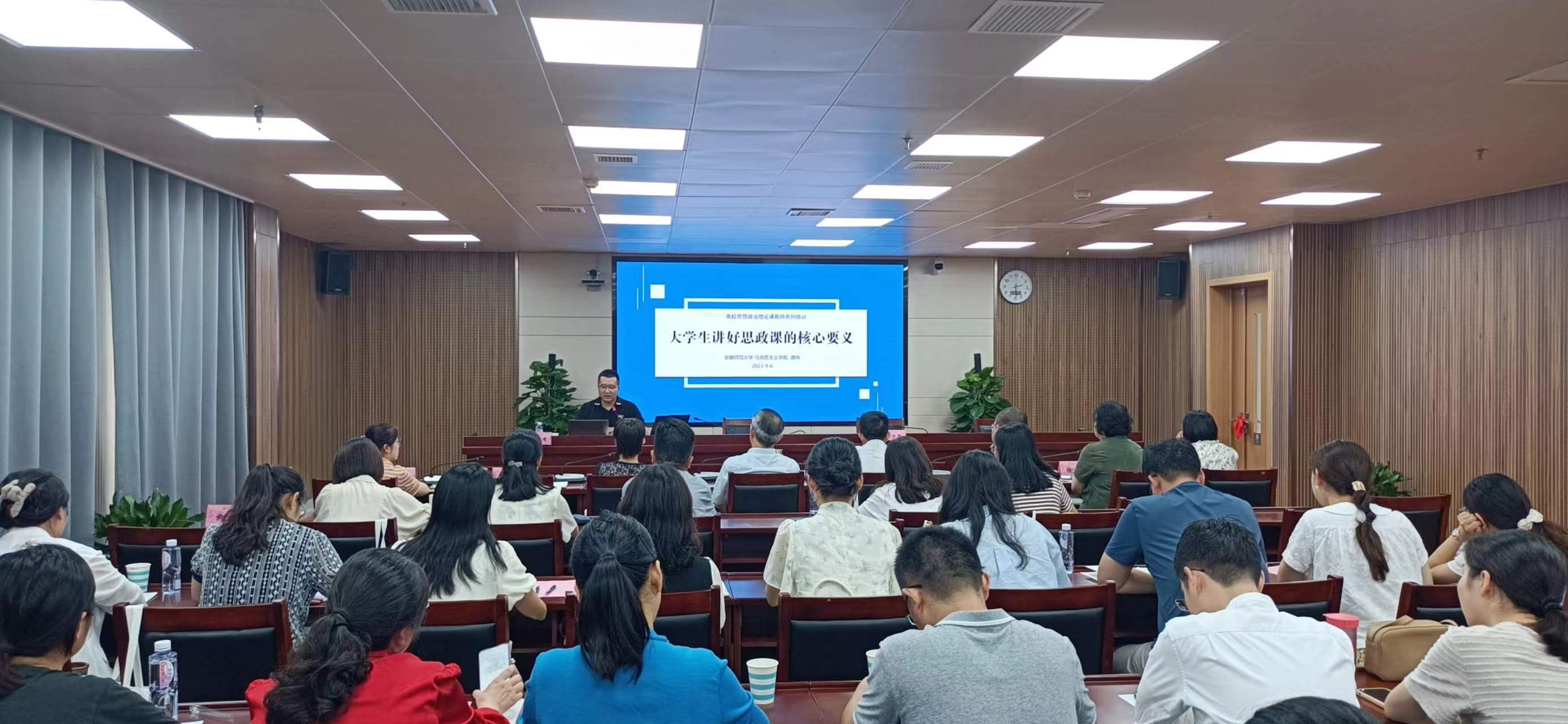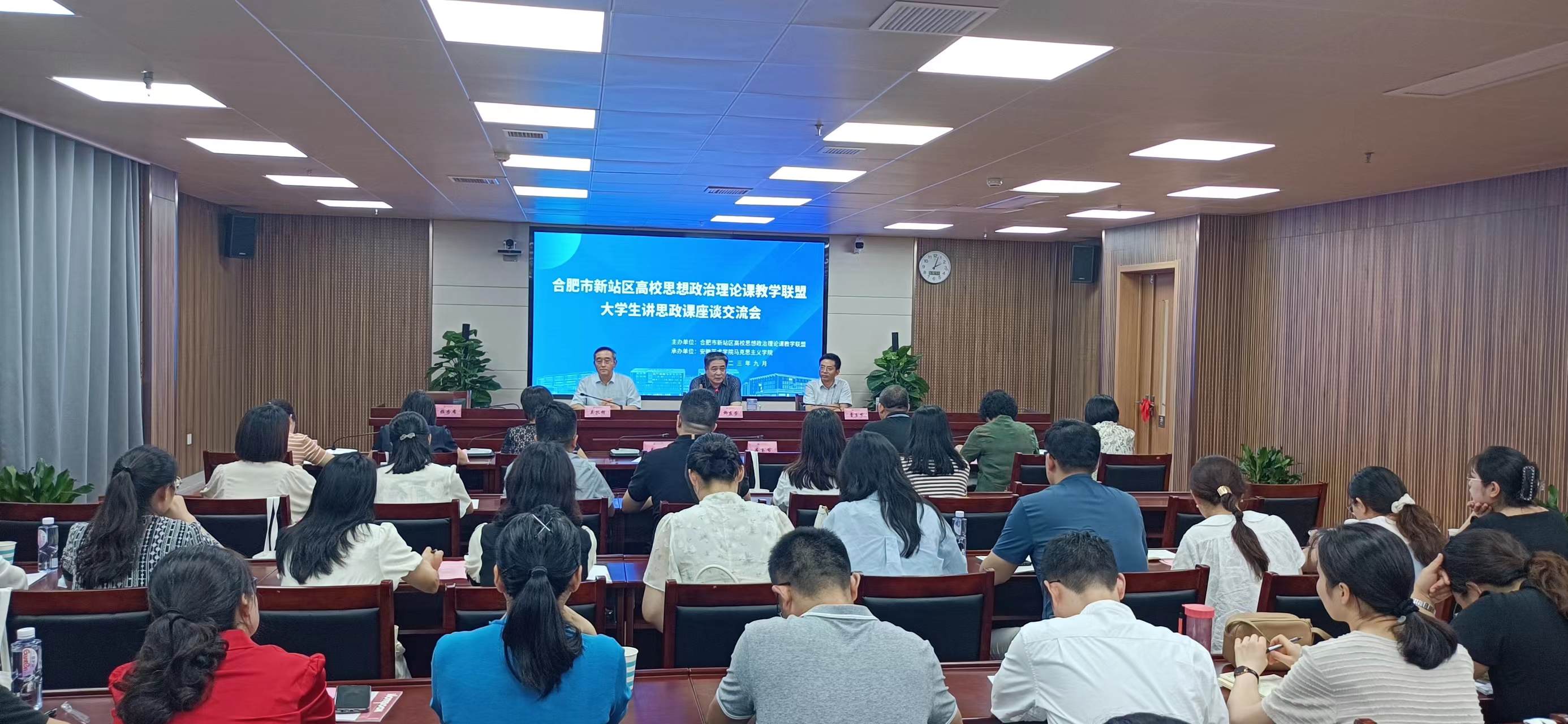 为开展好全省第二届大学生讲思政课展示活动,深化思政课改革创新,推进“大思政课”建设,9月6日下午,由新站区高校思想政治理论课教学联盟(以下称“教学联盟”)主办,安徽艺术学院马克思主义学院承办的“大学生讲思政课”座谈交流会在我校举行。教学联盟9所高校的马克思主义学院负责人以及相关思政课教师60余人参加会议。校党委委员、副校长柳友荣与会致辞。会议由马克思主义学院院长吴孔铎主持。