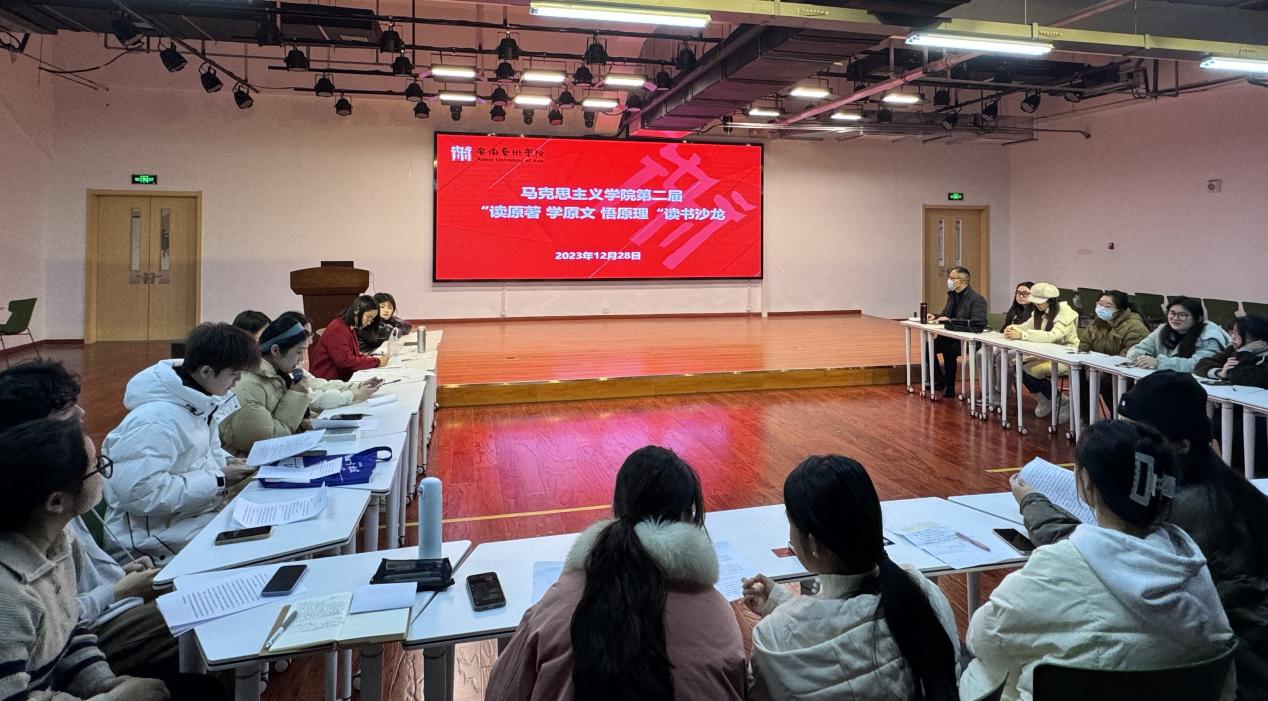 12月28日下午,马克思主义学院在大学生活动中心举办第二届“读原著·学原文·悟原理”读书沙龙活动。马克思主义学院副院长陈昀岚和“原理”课全体教师参与读书沙龙活动。