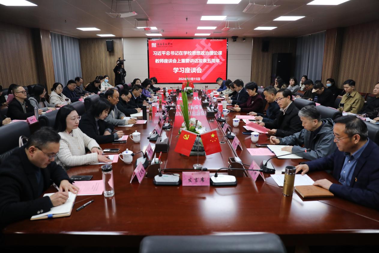 座谈会在集体重温习近平总书记在学校思想政治理论课教师座谈会上的重要讲话精神中开始。思政课教师代表朱哲恒、高元龙、陆淮光就“如何讲好学生满意的思政课?”进行交流。第二届全国高校思想政治理论课教学展示暨优秀课程观摩活动特等奖获得者高元龙结合个人经历讲述了为什么要当一名思政课教师。他表示,当思政课教师是人生最幸福的选择,思政课润物无声,但影响深远;讲好思政课要坚持内容为王,注重讲道理的方式方法,让学生感觉到思政课不是讲空洞的“大道理”,而是传递智慧和力量。宣传部副部长尹广富、教务处处长韩大国分别汇报五年来学校“讲道理也讲故事,有意义也有意思”的艺术思政育人品牌建设情况以及思政课程与课程思政双向奔赴的诸多探索。舞蹈学院院长戴虎、传媒学院党总支副书记张雷雷展示了五年来课程思政取得的各类成果。辅导员代表淳于义龙、王力平围绕“如何培养新时代艺术人才、做好大学生思想政治工作”展开交流。
