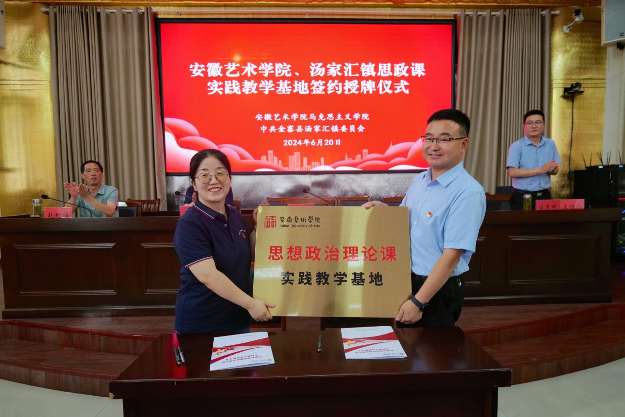6月20日下午,签约会在汤家汇镇政府大礼堂举行。汤家汇镇党委书记叶甜首先对马克思主义学院一行表示热烈欢迎,并简要介绍了汤家汇镇的红色资源。他表示,汤家汇镇丰富的红色遗存是开展大学生思想政治教育的天然课堂,希望双方以此为契机,深挖当地红色资源,为安徽艺术学院思政课实践教学改革赋能。马克思主义学院直属党支部书记陈昀岚对汤家汇镇党委政府领导同志的热情接待和对实践基地建设所给予的大力支持表示诚挚感谢,并表示未来将定期组织学生来此开展形式丰富的思政课活动,以革命文化丰富思政课教学,把思政课小课堂和社会大课堂起来,更好发挥思政课立德树人关键课程的作用。会议由汤家汇镇镇长储友斌主持,马克思主义学院一行及汤家汇镇相关领导出席了签约仪式。