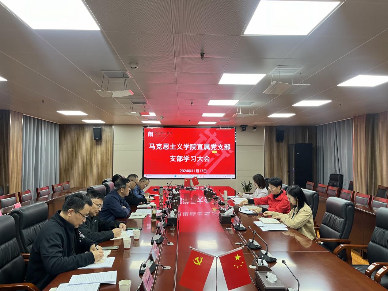 根据学校党委统一安排,11月13日下午,马克思主义学院直属党支部在综合楼716会议室召开支部学习会议,专题学习习近平总书记考察安徽重要讲话精神和党的二十届三中全会精神。学校党委书记韩军一行到会旁听指导。会议由马院院长吴孔铎主持,支部全体党员参加学习研讨。