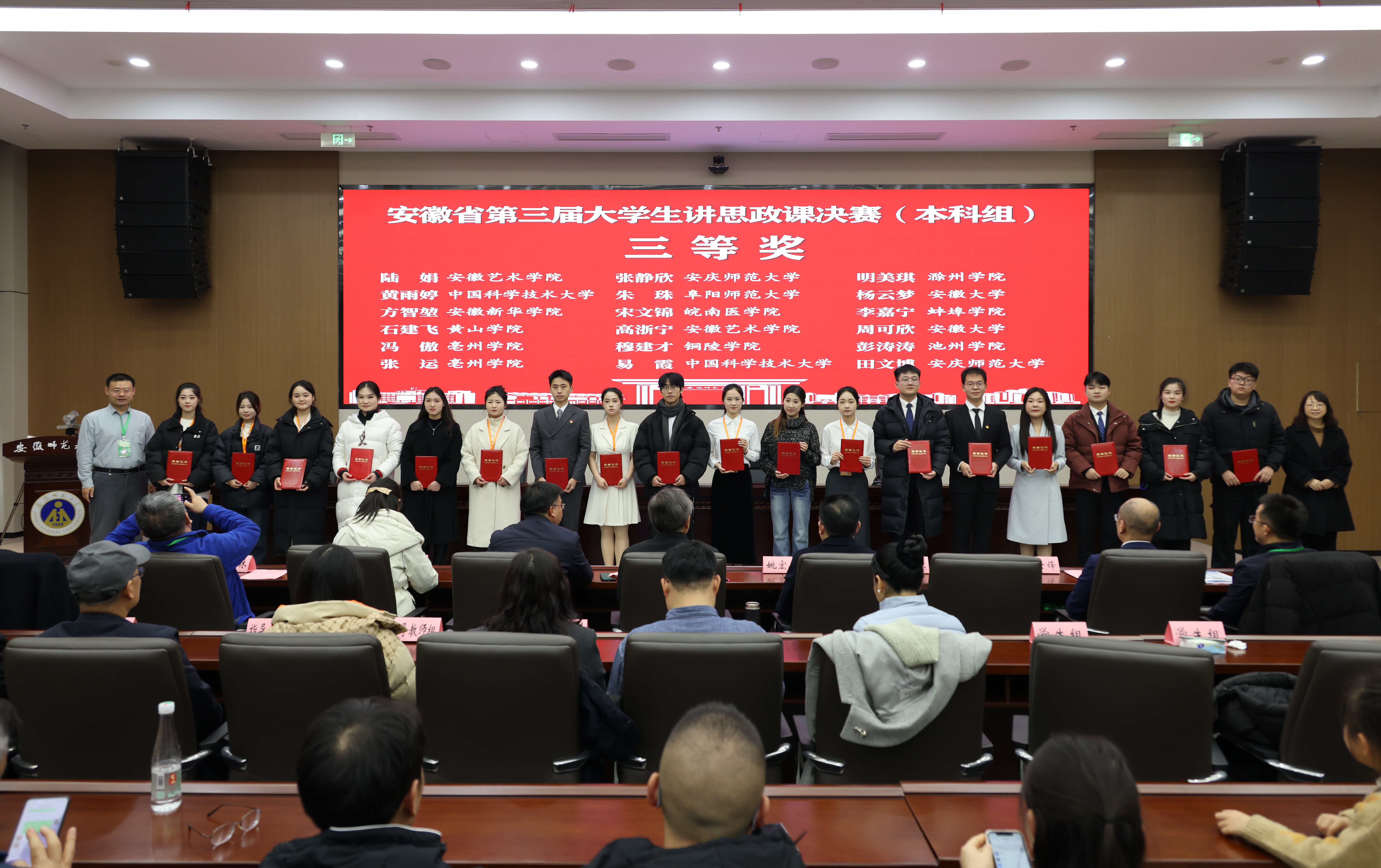 为深入学习贯彻习近平总书记对学校思政课建设作出的重要指示批示精神,全面落实新时代学校思政课建设推进会精神,深化思政课改革创新,着力推进“大思政课”建设,由中共安徽省委教育工委主办,教育部高校思想政治工作队伍培训研修中心(安徽师范大学)、安徽师范大学马克思主义学院承办的,以“七十五载薪火传承•千秋伟业奋斗有我”为主题的安徽省第三届大学生讲思政课决赛12月25日在芜湖举行。来自皖南、皖中、皖北三个片区赛推荐的全省30所高校的45支参赛队伍参加本科组决赛。经过激烈角逐,我校在皖中片区赛脱颖而出并入围省赛的4支队伍分别获特等奖1项,一等奖1项,三等奖2项。这是我校学子连续三届斩获省决赛特等奖。贺思源、杨梦娇、胡克春、杨婷婷等4名教师获优秀指导教师。