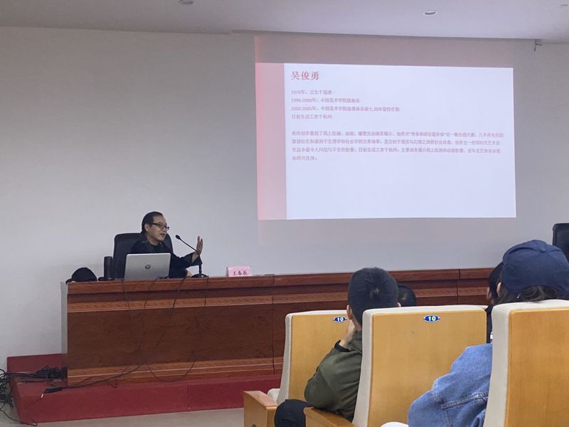 为更好开阔学生的眼界,提升学生对当代青年艺术的认知。2020年12月4日,由我校美术设计系主办的“当代的青年艺术”讲座在美术楼报告厅如期举行。本次讲座邀请了来自中央美术学院的王春辰教授为主讲人,由美术设计系罗耀东教授主持本次讲座。我系有一百余名师生共同聆听了讲座。