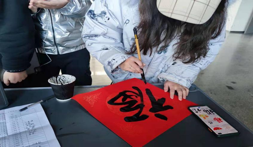 同学们带着新年的祝福挥毫泼墨,笔走龙蛇,全神贯注书写着春联,个个忙得不亦乐乎。把一幅幅体现着“欢乐和谐”、“平安祥和”等主题的春联无偿送到师生手中。会场里的每个人都有条不紊地做着相关工作,整个会场都被喜庆的红色渲染了。
