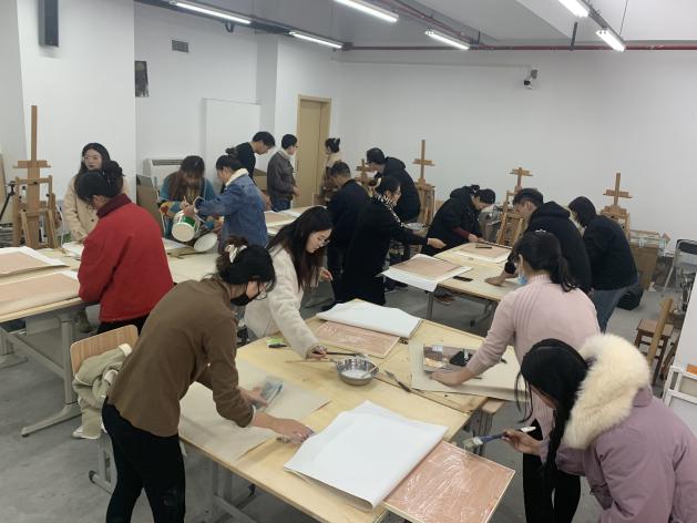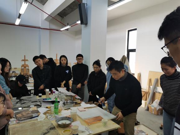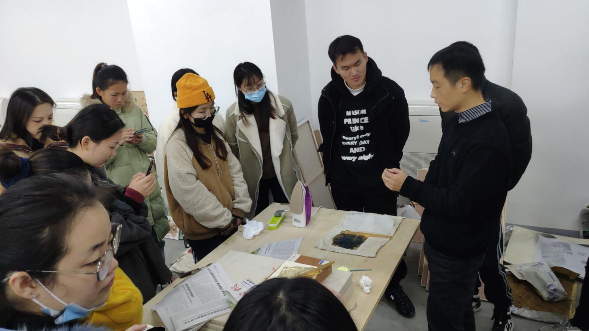 课程大概分三个部分,一,示范部分有:“通用技法”、“通用材料”的操作与使用。比如,贴箔、“箔变”、纸的处理方法、拼贴技法、现成品处理及使用、画底的制作、草木染等。二,理论部分有:讲述综合材料绘画的基本概念和它的发展脉络,重点介绍了它在当代的地位与价值。三,实践部分:每位同学选择了一个自己的主题,大家选择的材料技法几乎不重复,每个人通过完成一幅或多幅作品,从中掌握了对主题的把握,对材料的处理和应用,以及材料技法与主题的关系。