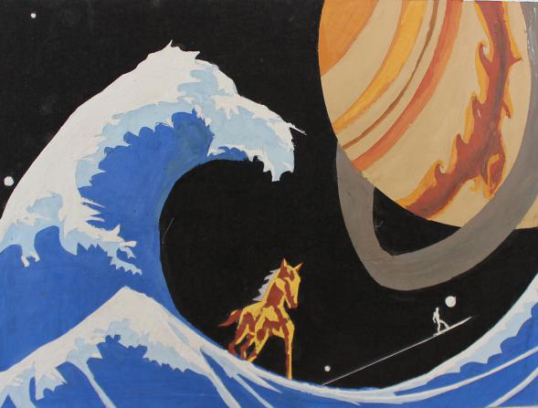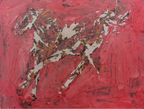 我的这幅系列作品在选题开始,我的灵感来源于一副用色艳丽大胆的一副网络作品,它并没有很华丽很浮夸的装饰,作品风格显得整体统一,仅仅是用颜色就能让人眼光停留。于是本着专业本能,我开始尝试于制作这种风格的作品,并以马为作品的主体物,马在中国传统文化中总是寓意着积极的意思,中国很多的文人大师也酷爱以马为主题做画。整幅作品的制作中,我用勾兑的腻子粉塑造出骏马的形象,并且尽量使得马的身形轮廓显得俊俏挺拔,英姿飒爽,不完全具象但又突出骏马的气质。虽然用黑色作为第二层底色,最后再用自己想用的颜色在马的身形与背景之间适当跟上,让整副画面既有黑色又有自己喜欢的颜色,最后在老师的指导下,我对马的身体进行了打磨,使其漏出一点点原有的白色勾勒马的身形,这样不仅仅显得马更加精神,在色彩上也更加的丰富多彩。