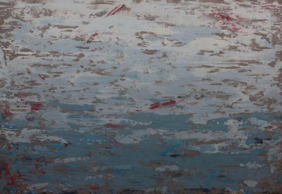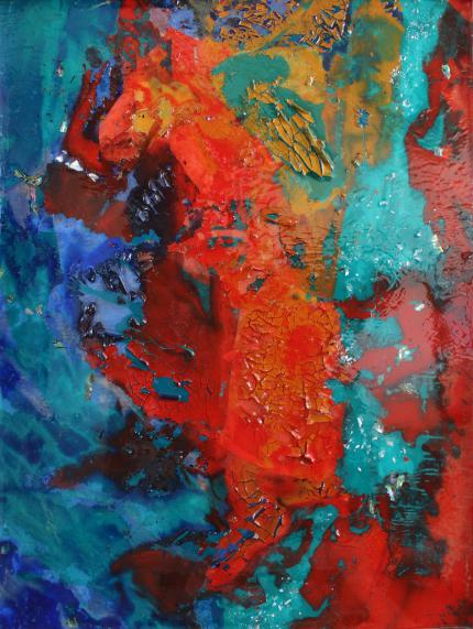创作阐述:在创作之前我研究了敦煌壁画,很多壁画的并不是同一时期完成的,在经历了时间的冲刷后有些表面的壁画剥落露出了被覆盖的颜色,这些剥落的地方和整幅壁画并不是一体的,但在时间的洗礼下与整幅壁画一起成为了文化遗产。冲撞的色彩象征壁画的生命力;颜料剥落、开裂和翘起的地方是时间赋予壁画的韵味;封层则是凝固,愿时光永固为人类留下这些文化瑰宝!