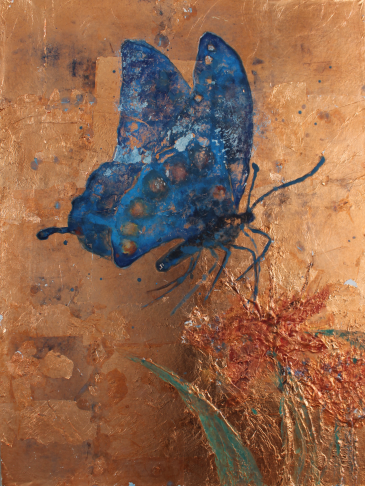技法、制作过程:先用腻子粉加上白乳胶做出肌理感,然后在板上堆砌出想要的形状。等待变干,用铜箔覆盖一层,再把形拓上去,最后用矿物质颜料以“撞色”的方式画出昆虫的形。