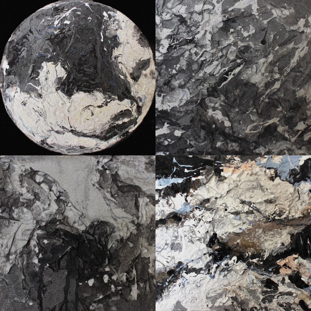 材料作品技法说明:材料上主使用了木板,亚麻布,白乳胶,水粉颜料,螺钿,宣纸和环氧树脂。首先将水粉颜料按照一定比例稀释后泼撒在宣纸上,再将泼出的图形重新裁剪、组合拼贴,最后用环氧树脂封层。