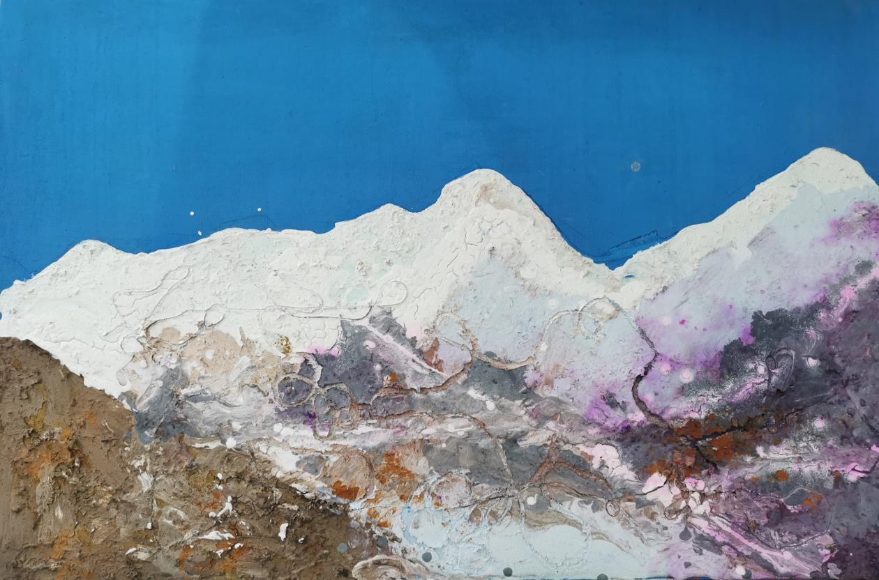 技法、制作过程:先用泥土和红砖粉末加上白乳胶做层有肌理感的底并在上面涂抹蓝色作为背景,在背景板上用麻绳勾勒出山的大概山的形状,并在区域内预埋粗细不同的绳子。在用不同浓度与不同颜色比例的腻子粉白乳胶调配的颜料在背景上进行堆砌。在用不同的颜色对比做出山的一个层次,在画面半干状态下,把提前预埋的绳取出,做出一种不同的肌理效果和不同的颜色视觉效果。达到一种形散神聚并颜色丰富山石的状态。