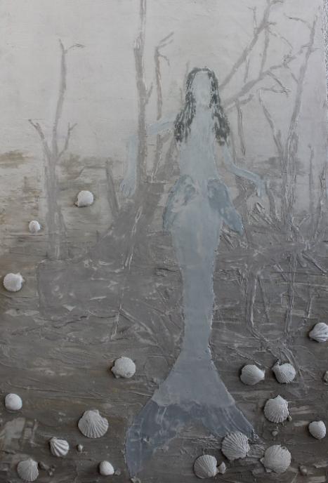 技法、制作过程:首先用腻子与细沙石混合铺底做出底部沙滩的肌理效果,其次勾勒出人鱼和树干的外轮廓后用腻子填充,做出背景与主题后用腻子加入不同颜色浓度的丙烯颜料后在鱼尾和头发处上色,为了做出鱼鳍的色彩变化,上色后进行打磨。用刮刀勾勒出脸型,最后在画面底部贴上贝壳。