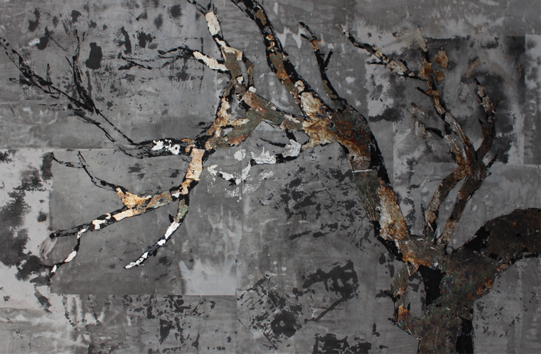 技法、制作过程:准备素材阶段:生宣上泼墨染墨;绘制阶段:把矾好的熟宣裱在画板上,待干后,再把预先染墨的宣纸裁成大小不一的方形,拼贴在裱好的熟宣画板上。在纸上画好枯树枝的形再拓印画面上,用黑色丙烯填上重颜色部分,最后贴上烧好的银箔。