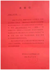 为践行学校第一届党代会精神,积极服务社会发展,提高反诈防骗意识,2022年1月21日-1月27日,美术设计系2021级视觉传达设计2班的柯唤同学积极响应池州市青阳县公安局蓉城派出所的号召,积极参加所在辖区的“大学生义警”志愿者服务活动,向社区群众宣传防范电信诈骗,维护社区治安,由于柯唤同学表现突出,2022年2月6日蓉城派出所特向我院发来表扬信,给予高度赞扬。