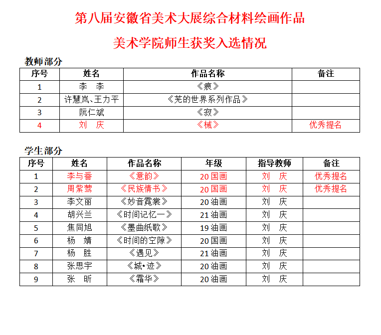 近日,从安徽省美术家协会官方公众号获悉,由安徽省文学艺术联合会、安徽省美术家协会主办的第八届安徽省美术大展综合材料绘画展公布了最终结果,美术学院师生共有13人入选本次展览、其中3人获奖。本学期美术学院本着“以展促教、以展促学”原则积极组织备战多个展览,且取得了显著的成果。