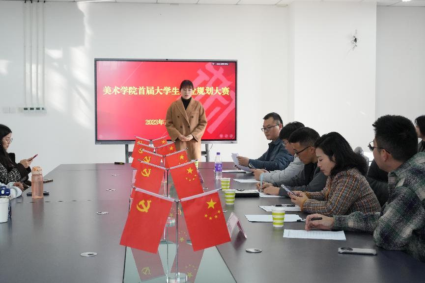 为贯彻落实党的二十大精神,增强大学生职业规划意识,11月14日下午,美术学院在美术楼307会议室举办大学生职业生涯规划大赛。美术学院党总支副书记李卫国、传媒学院学管办负责人陈伟伟、设计学院学管负责人王亚鹏、美术学院团总支负责人阮仁斌和学管办负责人刘民老师出席此次比赛并担任评委。各班级共13名选手参加参赛,部分学生到场观摩比赛。