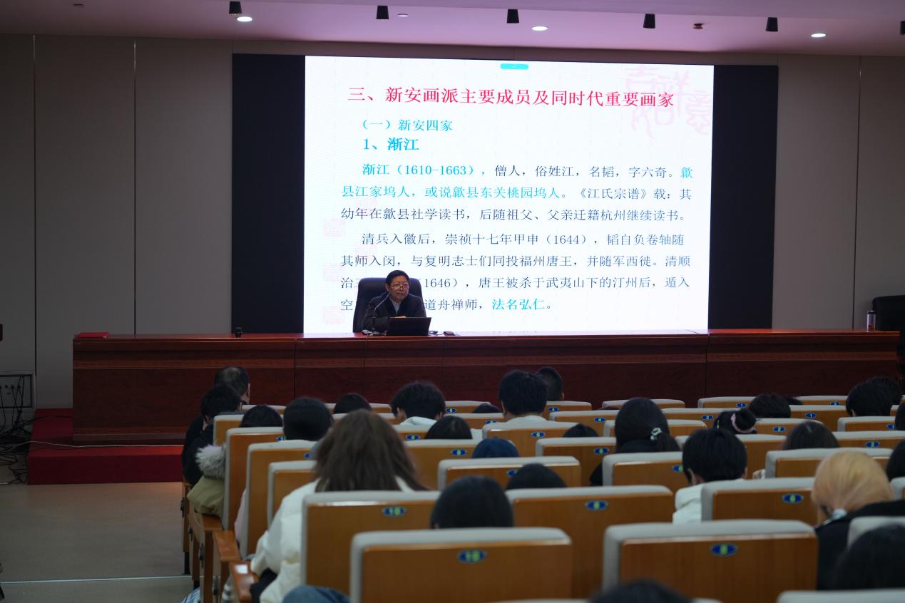 11月25日下午三点,新安画派大讲堂第二讲在美术楼一楼学术报告厅举行,陈祥明教授主讲题为《从渐江到黄宾虹--新安画派概观》的学术报告。安徽艺术学院原院长樊嘉禄、美术学院党总支书记陈明海及美术学院师生共同聆听了讲座。讲座由新安画派研究院院长刘伟主持。