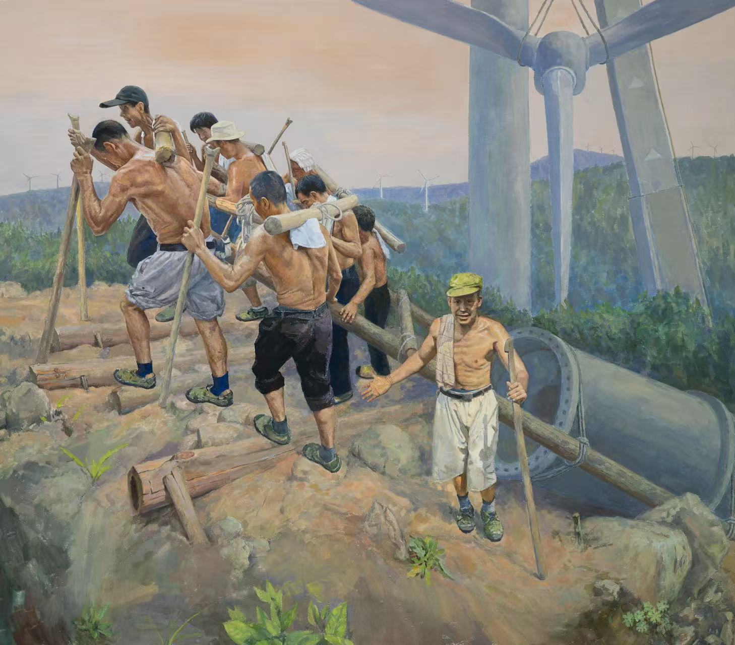 《向云端》作品介绍:画面通过描绘一群民工在险要的山坡上,在现代化的机械设备无法到达的地方,用人力将笨重的风力发电设备搬运到山顶的场景。反映了我国绿色发展进程中一个个让人难忘的瞬间之一。旨在描绘一批普通人在经济社会发展和进步中的付出和贡献。画面以对角线构图为主,以此来表现强大的上升力量,烘托“向云端”主题。画面右侧背景正在吊装的风车顶天立地,直抵云端,与人群形成强烈的对比,增加了画面的冲击力,同时也是对对角线构图的均衡,进一步烘托了向云端这一主题。