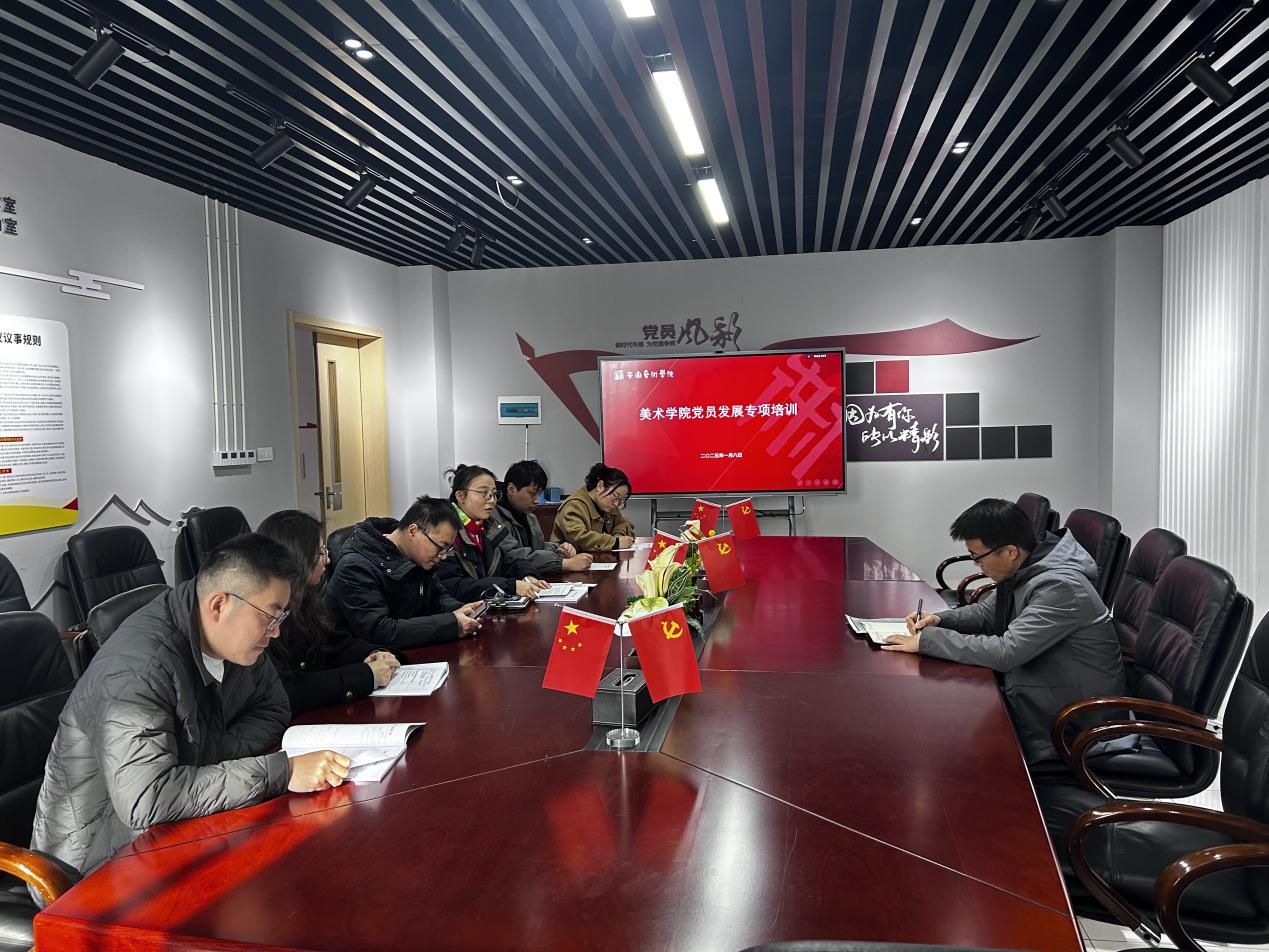 1 月 8 日,美术学院于学院会议室举行党员发展专项培训会。会议由党总支副书记李卫国主持,学生党支部书记张婷婷主讲,党总支组织员及全体辅导员参会。
