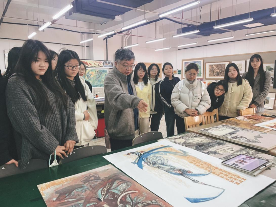2025年3月11日下午,安徽艺术学院客座教授、中国美术家协会理事、安徽省美术家协会副主席、版画艺委会主任师晶,莅临美术学院版画工作室指导工作。师晶教授细致点评了每位毕业生的版画作品,从构图形式到主题内容都给予了专业指导。面对2024级版画方向的新生,师晶殷切寄语,勉励同学们勇担新时代艺术使命,积极投身创作实践,为新徽派版画艺术的传承与创新贡献青春力量。师晶平易近人的态度与高屋建瓴的指导,令在场学子如沐春风,备受鼓舞。