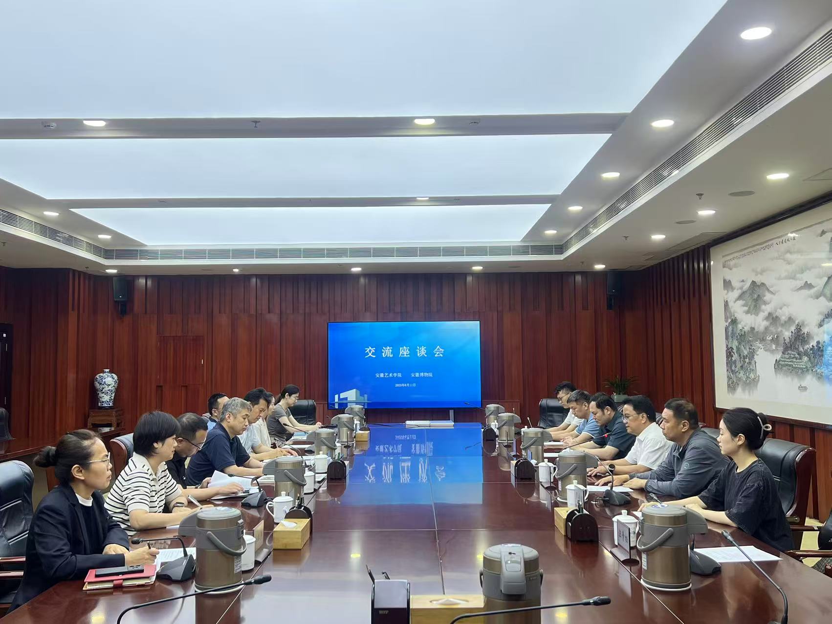 为高质量推进《新安画派临摹范本精品选集》第二辑的编撰与出版工作,深化院校与文博机构的合作,6月11日下午,美术学院党总支书记陈明海、新安画派研究院院长刘伟及中国画教研室教师代表一行赴安徽博物院进行专题调研。安徽博物院副院长季永、刘华伟及相关业务部门负责人出席,会议由刘华伟主持。