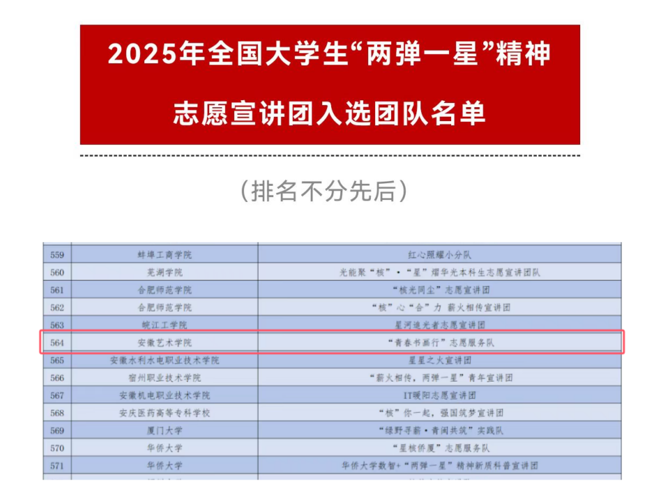 以习近平新时代中国特色社会主义思想为指引,全面贯彻落实党的二十大、二十届二中、三中全会和全国教育大会精神。引导新时代广大青年学生坚定爱国报国信念,大力弘扬与传承“两弹一星”精神,激发广大青年投身强核强国事业的热情,团中央青年志愿者行动指导中心与中国核工业集团有限公司联合开展2025年全国大学生“两弹一星”精神志愿宣讲活动。安徽艺术学院美术学院“青春书画行"志愿服务队成功入选,也是我校唯一入选的志愿团队。