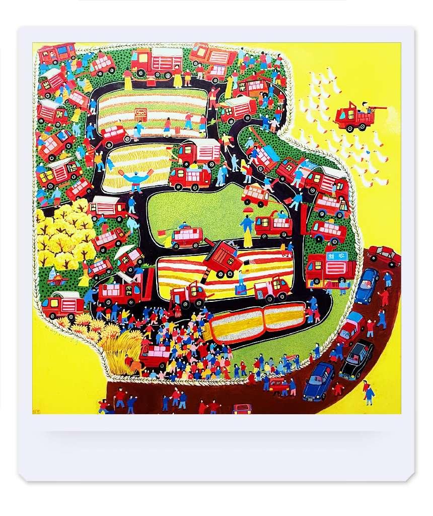 本作品以中国农耕文明为内核,通过当代乡土绘画的视觉语言,展现了新时代乡村振兴的壮美画卷。画面以层叠的田野为背景,将传统农事场景与现代科技农业并置,金黄稻浪与大型器械播种、收割场景与文旅观景形成诗意对比;以细腻的笔触刻画农民形象的坚韧与希望,辅以象征丰收的民俗符号,如麦穗、家禽与智能化机器,隐喻农耕文化的传承与创新。作品融入丙烯与综合材料的肌理层次,在写实与抽象间构建出乡土中国的时代叙事,致敬土地的同时,亦表现出人与自然共生共荣的未来图景。